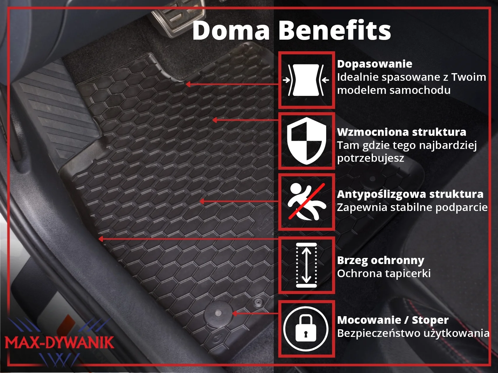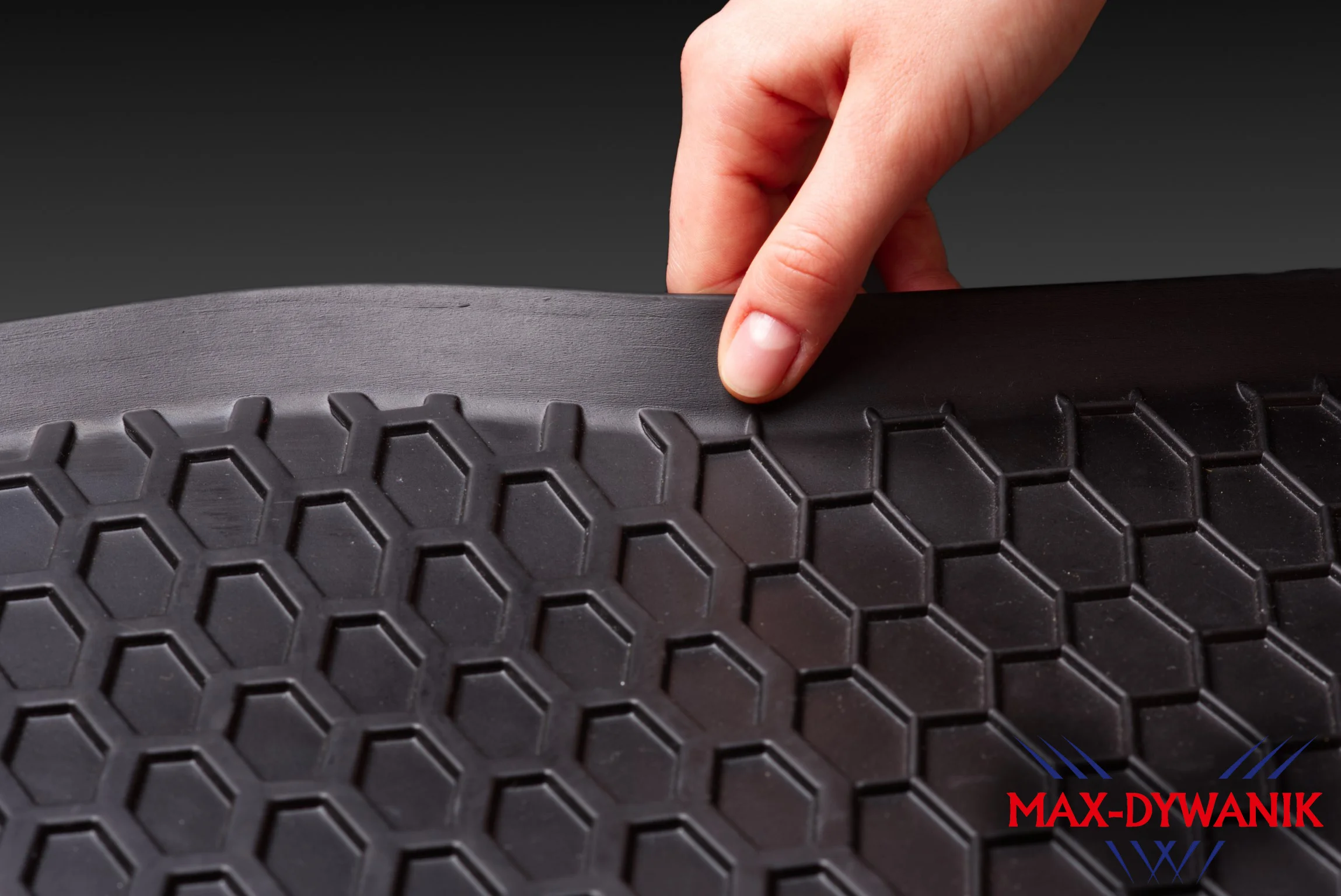 Dywaniki są produkowane z wysokiej jakości mieszanki gumowej, która nie zawiera szkodliwych substancji, dzięki czemu są w pełni bezpieczne dla zdrowia. Co więcej, materiał jest bezzapachowy, więc po zamontowaniu nie musisz martwić się o nieprzyjemne zapachy we wnętrzu auta – nawet podczas upałów. Gumowa powierzchnia jest trwała, odporna na ścieranie i pękanie, co zapewnia długotrwałe użytkowanie.