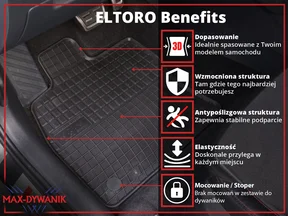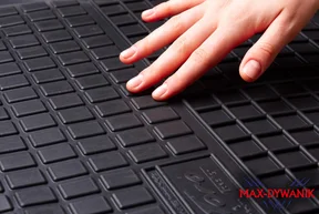 Dywaniki wyróżniają się także estetyczną strukturą kratki, która skutecznie zatrzymuje brud, piasek i wodę, ułatwiając utrzymanie czystości we wnętrzu auta. Czyszczenie dywaników jest wyjątkowo proste — wystarczy je spłukać wodą lub przetrzeć wilgotną ściereczką, aby odzyskały świeży wygląd.