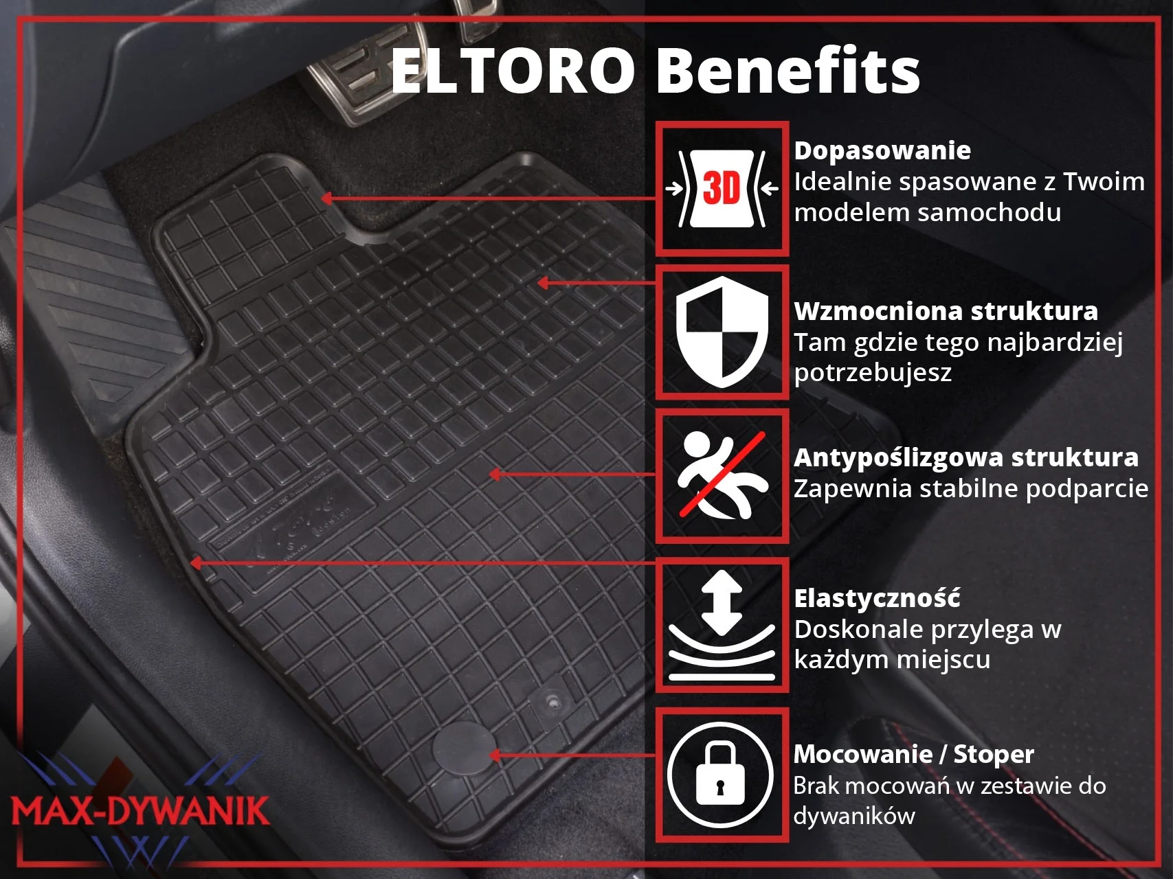 Każdy komplet jest precyzyjnie zaprojektowany dla konkretnego modelu samochodu, dzięki czemu kształt dywaników idealnie odwzorowuje płytę podłogową. Zapewnia to nie tylko doskonały wygląd, ale przede wszystkim skuteczną ochronę fabrycznej wykładziny przed zabrudzeniami, wilgocią i uszkodzeniami.
