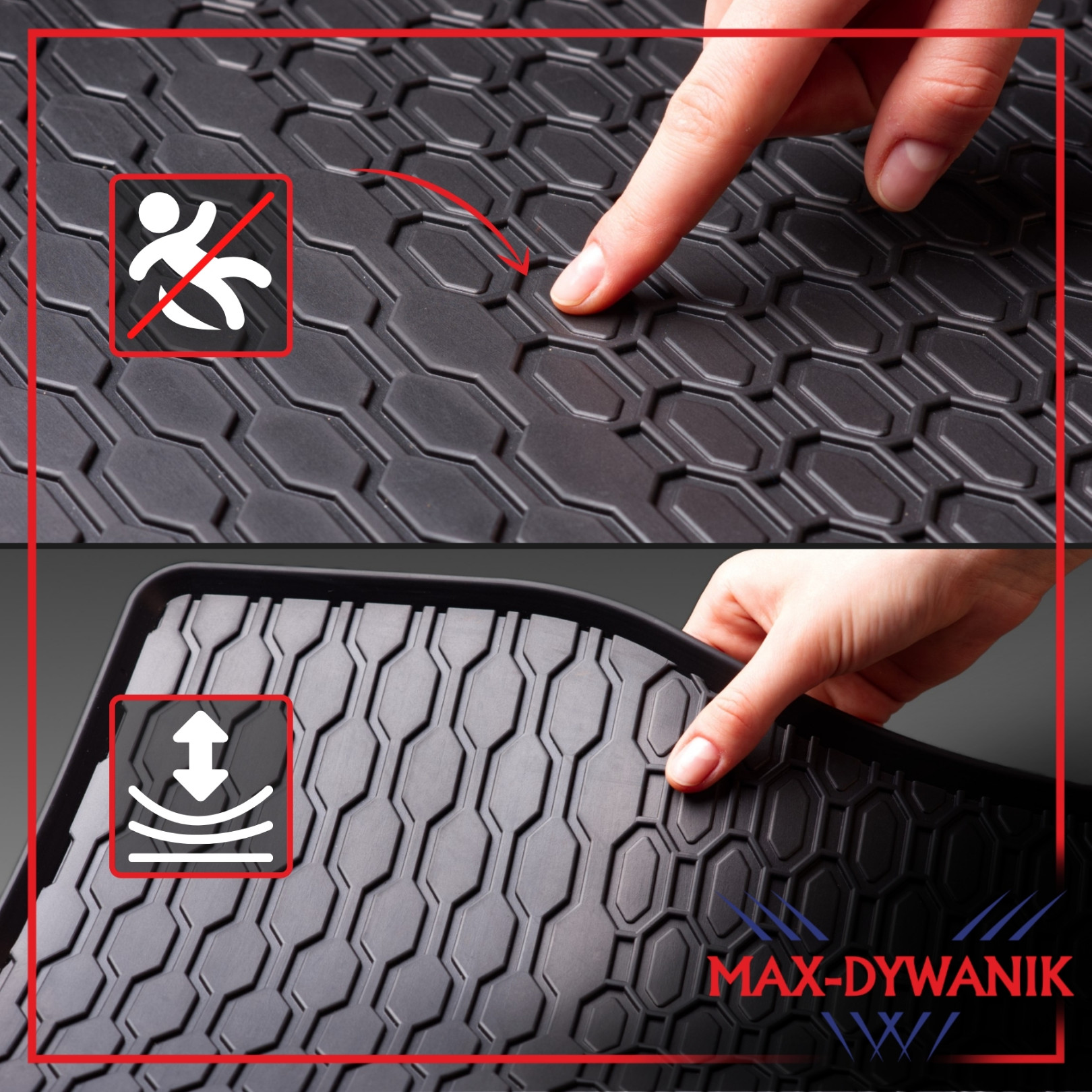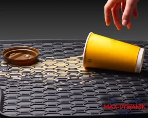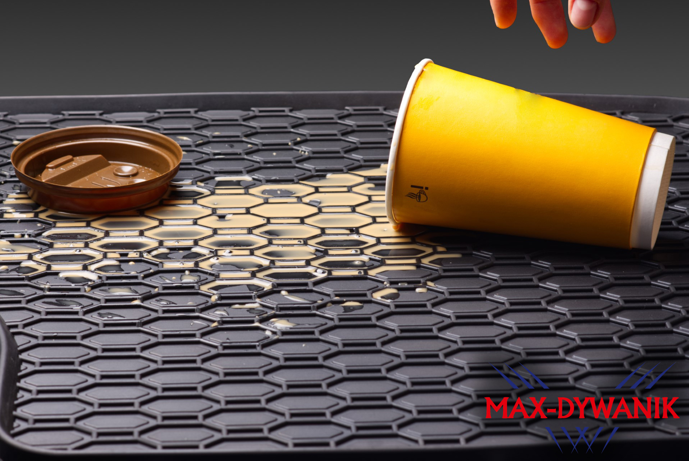 Dywaniki wyróżniają się także estetyczną strukturą kratki, która skutecznie zatrzymuje brud, piasek i wodę, ułatwiając utrzymanie czystości we wnętrzu auta. Czyszczenie dywaników jest wyjątkowo proste — wystarczy je spłukać wodą lub przetrzeć wilgotną ściereczką, aby odzyskały świeży wygląd.