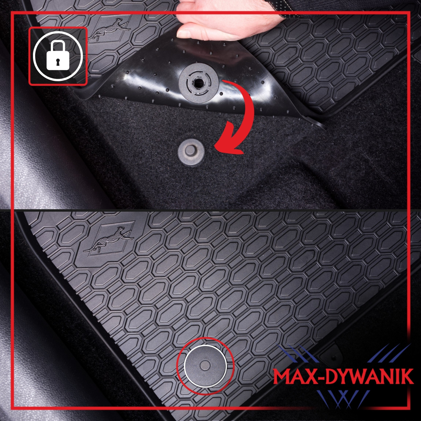Nasze dywaniki samochodowe dostarczane są zawsze z zestawem mocującym, dopasowanym do danej marki/modelu samochodu (mocowania zamontowane są już oryginalnie na dywanikach i przystosowane pod oryginalne uchwyty występujące fabrycznie w podłodze samochodu). Dywanik kierowcy musi zawsze być mocowany do podłogi, podczas gdy możliwość mocowania dywaników pasażerów (z przodu i z tyłu) uzależniona jest od zaprojektowania takiego rozwiązania przez producenta danej marki samochodu.
