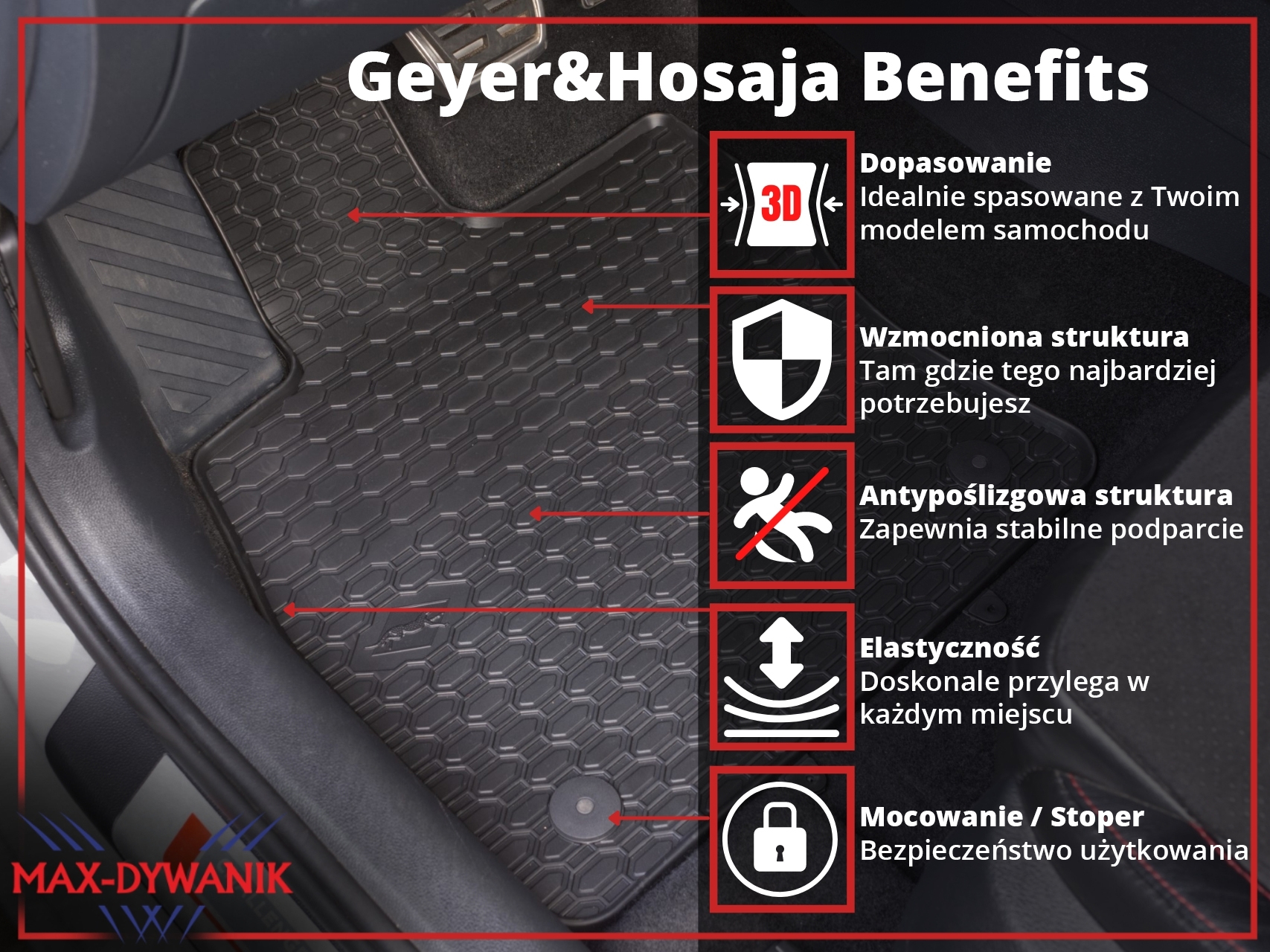 Dywaniki GEYER&HOSAJA stworzone w technologii skanowania podłogi samochodu gwarantują perfekcyjne dopasowanie, elegancki wygląd oraz skuteczną ochronę tapicerki przed zabrudzeniem i zalaniem.