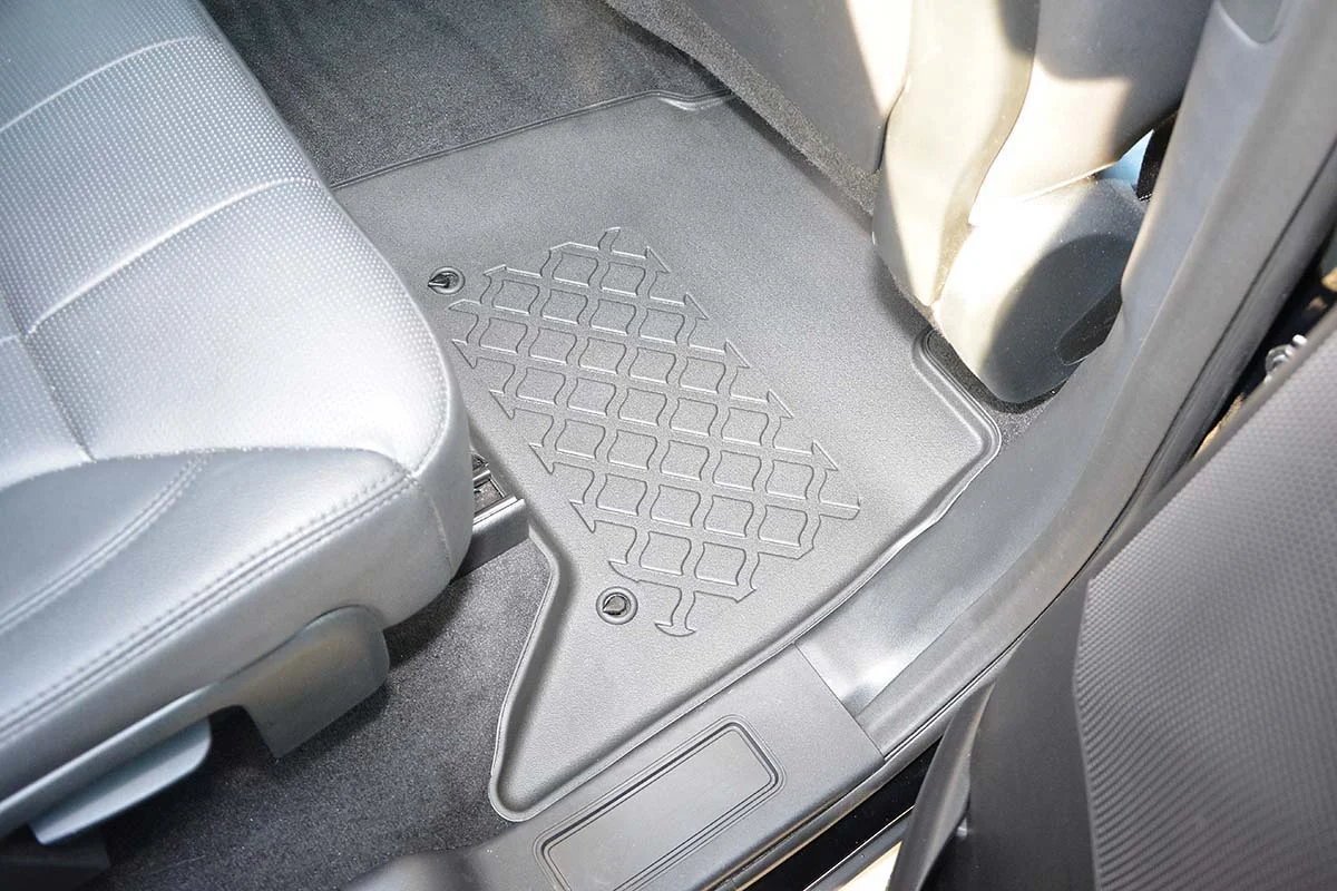 Wysoki brzeg dywaników chroni wnętrze auta przed zabrudzeniami, zamontowane stopery zapobiegają przesuwaniu się dywaników, zapewniając bezpieczeństwo podczas jazdy.
