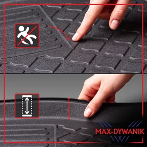 Dywaniki wyposażono w wysoki rant ochronny o wysokości ok. 2-3 cm, który skutecznie zatrzymuje wodę, błoto oraz inne zanieczyszczenia, zapobiegając ich przedostawaniu się na podłogę samochodu. Dzięki temu wnętrze pojazdu pozostaje czyste, nawet podczas trudnych warunków pogodowych.