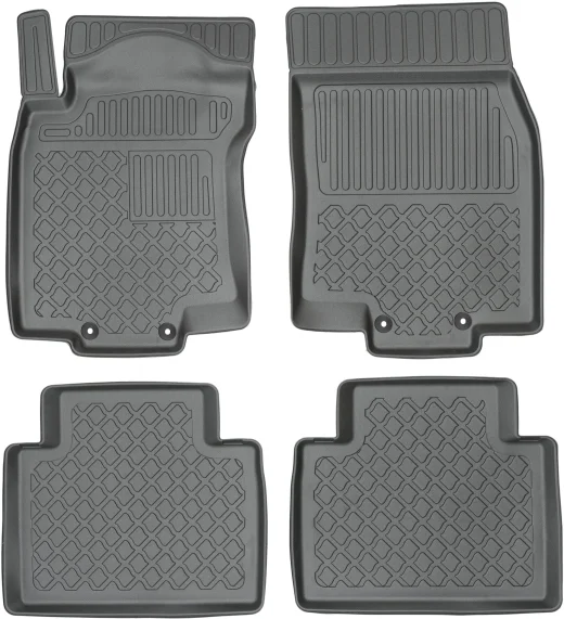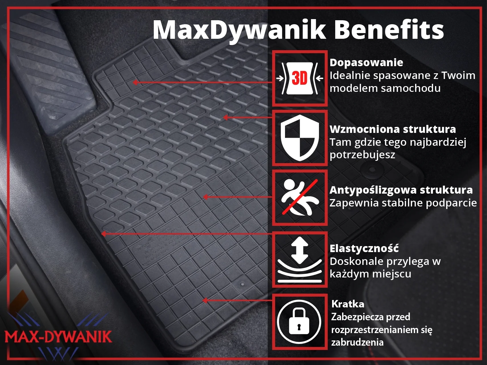 Komplet dywaników został starannie zaprojektowany i dedykowany do konkretnego modelu auta, co oznacza, że dywaniki są precyzyjnie dopasowane do płyty podłogowej oraz rodzaju nadwozia. Takie rozwiązanie gwarantuje maksymalny komfort użytkowania oraz pełne bezpieczeństwo, ponieważ dywaniki idealnie przylegają do podłogi i nie przesuwają się nawet podczas dynamicznej jazdy.