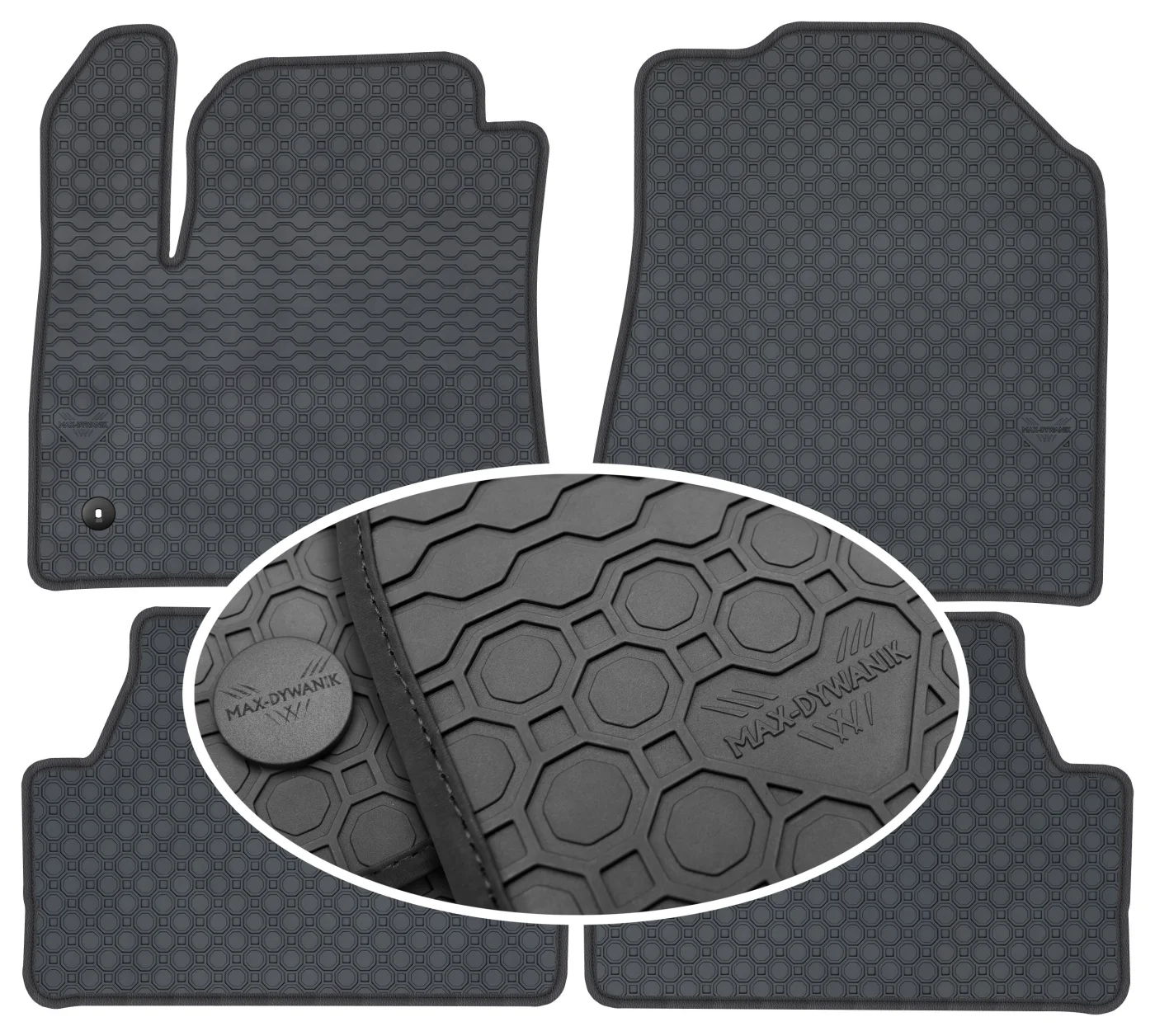 Wierzchnia strona dywaników, wypełniona na całej powierzchni strukturą ośmiokątów (plastra miodu) została pokryta podwójną warstwą gumy. Spód pokryty gumowymi wypustkami, które znacząco wydłużają żywotność materiału oraz zabezpieczają przed przesuwaniem się dywaników podczas jazdy. Specjalnie zaprojektowane wzmocnienie na dywaniku kierowcy zostało stworzone w oparciu o wieloletnie doświadczenie chroniąc najbardziej wrażliwą część dywanika przed przetarciem.