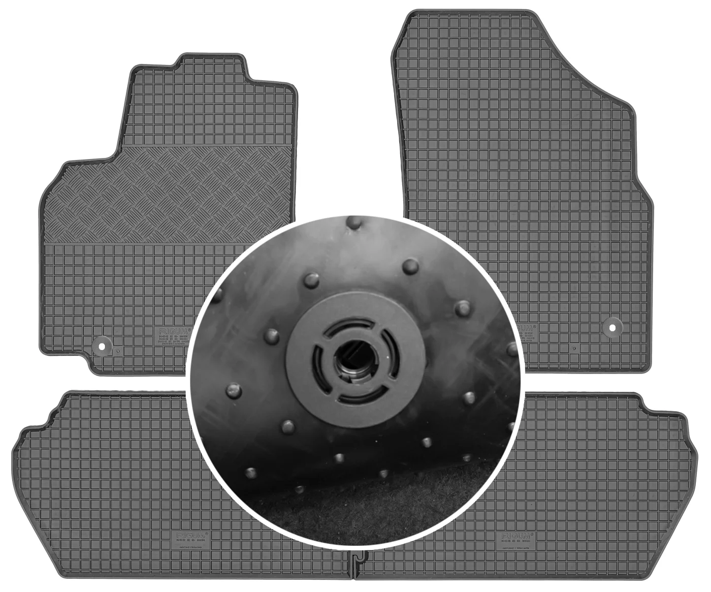 Przedmiotem oferty jest komplet dywaników renomowanej czeskiej firmy RIGUM idealnie dopasowanych do kształtu płyty podłogowej samochodu z delikatnym brzegiem ochronnym oraz strukturą kratki.