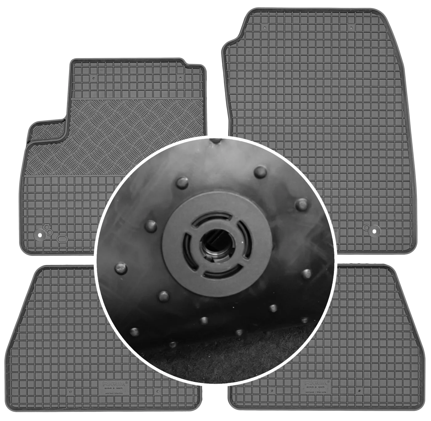 Przedmiotem oferty jest komplet dywaników renomowanej czeskiej firmy RIGUM idealnie dopasowanych do kształtu płyty podłogowej samochodu z delikatnym brzegiem ochronnym oraz strukturą kratki.