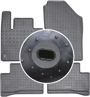 Estetyczny kołnierz (brzeg) ochronny dookoła dywaników skutecznie zatrzymuje wodę i brud, zabezpieczając oryginalną tapicerkę samochodową przed zabrudzeniem. Dywaniki od spodu posiadają zaprojektowane malutkie kolce, które w dodatkowy sposób chronią je przed przesuwaniem. Dywanik kierowcy został dodatkowo wzmocniony w miejscu najbardziej newralgicznym (miejsce styku pięty z powierzchnią dywanika) tak, aby zabezpieczyć dywanik przed przetarciem.