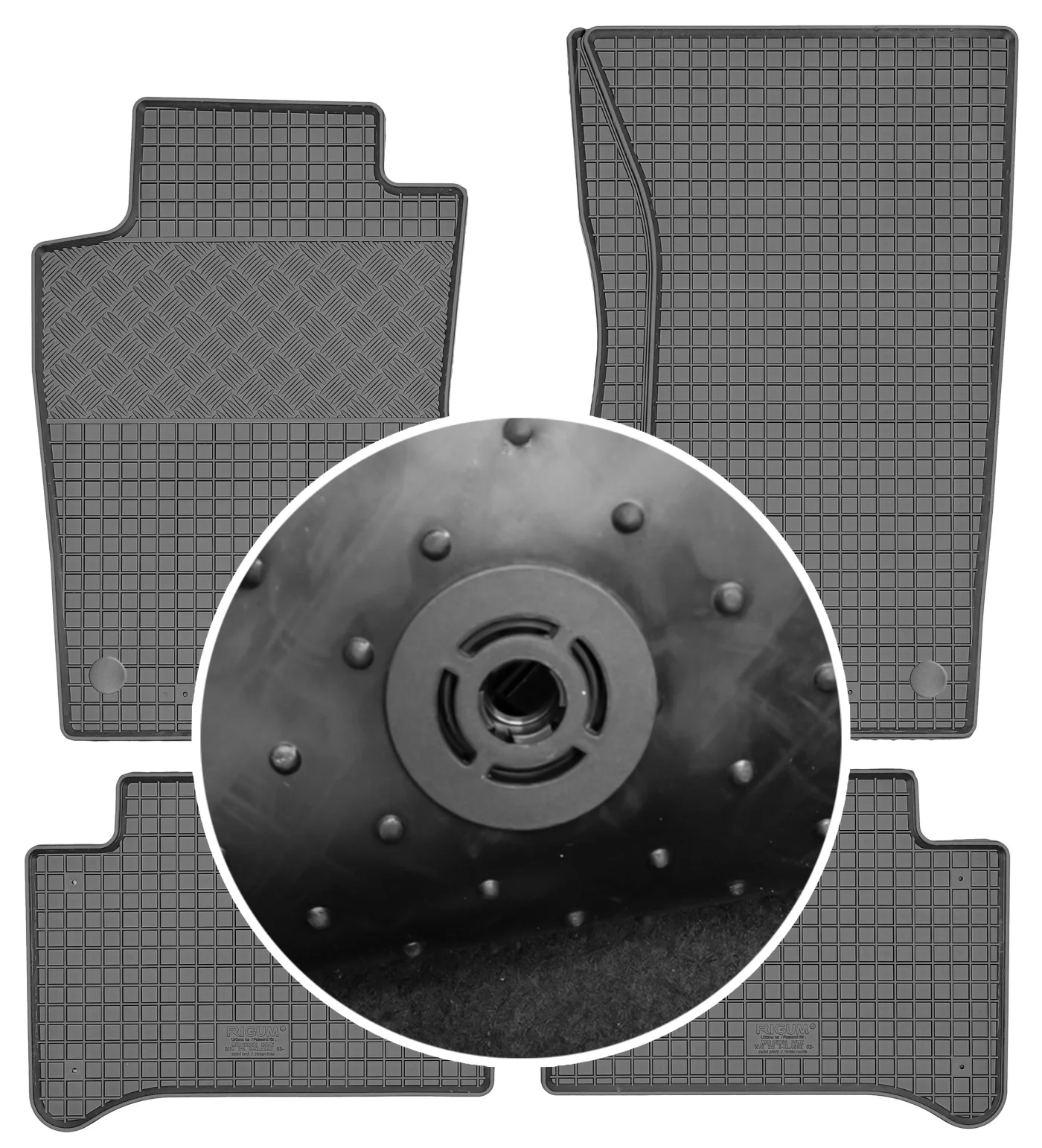Przedmiotem oferty jest komplet dywaników renomowanej czeskiej firmy RIGUM idealnie dopasowanych do kształtu płyty podłogowej samochodu z delikatnym brzegiem ochronnym oraz strukturą kratki.