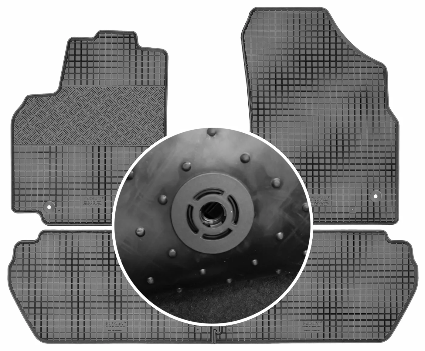 Przedmiotem oferty jest komplet dywaników renomowanej czeskiej firmy RIGUM idealnie dopasowanych do kształtu płyty podłogowej samochodu z delikatnym brzegiem ochronnym oraz strukturą kratki.