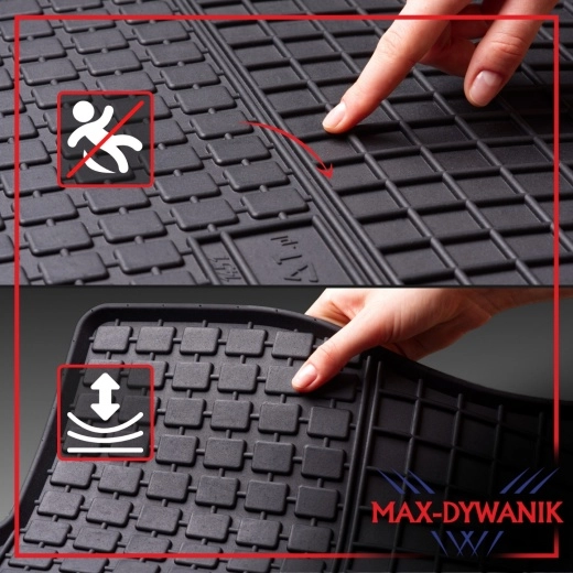 Kolor: Czarny Surowiec: Guma naturalna Dywaniki: Dopasowane pod model Przeznaczenie: Dywaniki podłogowe