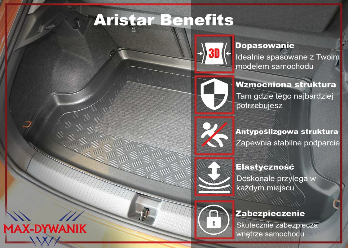 Oferujemy solidną i dopasowaną matę do bagażnika firmy Aristar, która zapewnia porządek i ochronę wnętrza auta. Wysoki rant skutecznie zatrzymuje wodę i zabrudzenia, a powierzchnia antypoślizgowa zapobiega przesuwaniu się ładunku. Mata kompatybilna z uchwytami na pasy i systemami szyn.