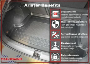 Mata do bagażnika Aristar to doskonały wybór dla każdego kierowcy, który chce skutecznie zabezpieczyć wnętrze swojego samochodu. Specjalnie zaprojektowany wysoki brzeg ochronny skutecznie zatrzymuje wodę, błoto, piach i inne zabrudzenia, chroniąc oryginalną wykładzinę bagażnika przed uszkodzeniami i trudnymi do usunięcia plamami. Na środku maty znajduje się praktyczna wkładka antypoślizgowa, która zapobiega przesuwaniu się ładunku podczas jazdy, zwiększając bezpieczeństwo przewożonych przedmiotów.