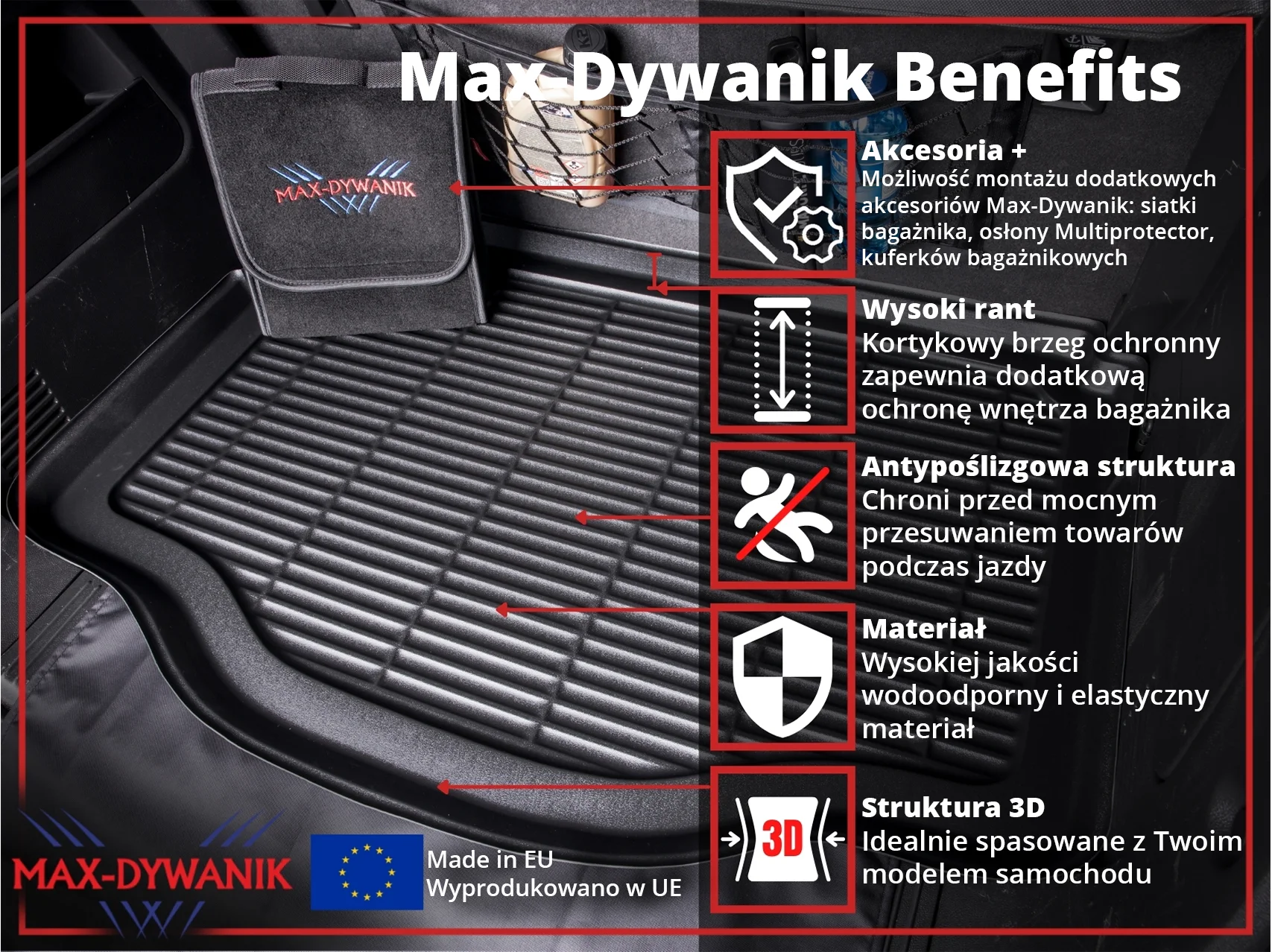 Wkład do bagażnika Max-Dywanik to idealna ochrona przestrzeni bagażowej Twojego auta! Produkt został zaprojektowany z myślą o maksymalnej funkcjonalności i estetyce. Dzięki wysokiemu brzegowi ochronnemu skutecznie zabezpiecza bagażnik przed wylewaniem się wody, błota i innych zabrudzeń