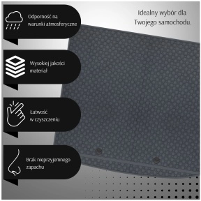 Wierzchnia strona maty, wypełniona na całej powierzchni strukturą ośmiokątów (plastra miodu) została pokryta podwójną warstwą gumy. Spód został pokryty gumowymi wypustkami, które znacząco wydłużają żywotność materiału oraz zabezpieczają przed przesuwaniem się dywanika podczas jazdy samochodem.