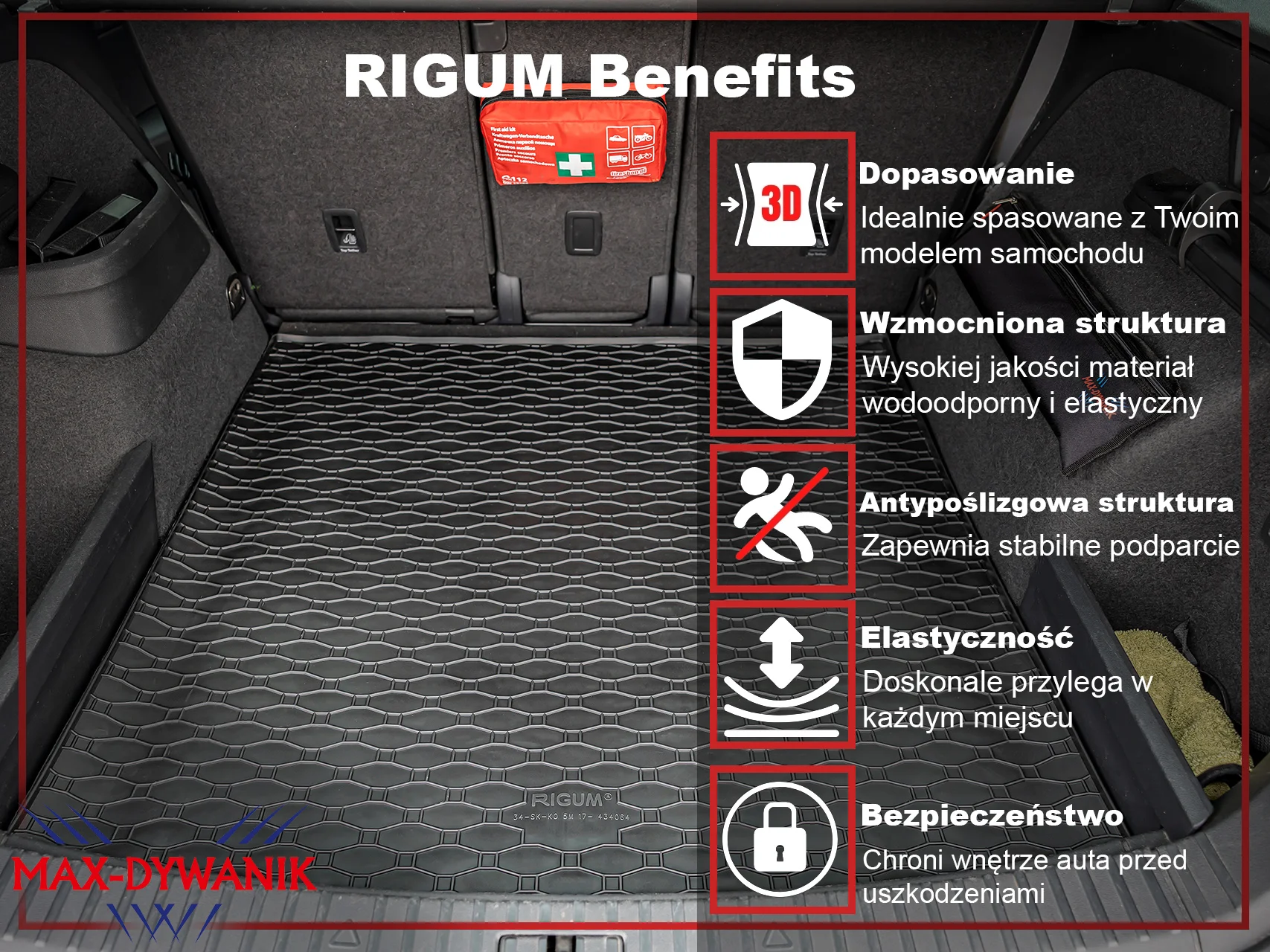 Gumowa mata czeskiej firmy RIGUM – gwarancja jakości i ochrony podłogi bagażnika. To wkład do bagażnika w wersji premium, który nie tylko ułatwia utrzymanie czystości w samochodzie, ale także nadaje wnętrzu designerski charakter. Praktyczny produkt, zaprojektowany tak, aby służył Ci przez lata.