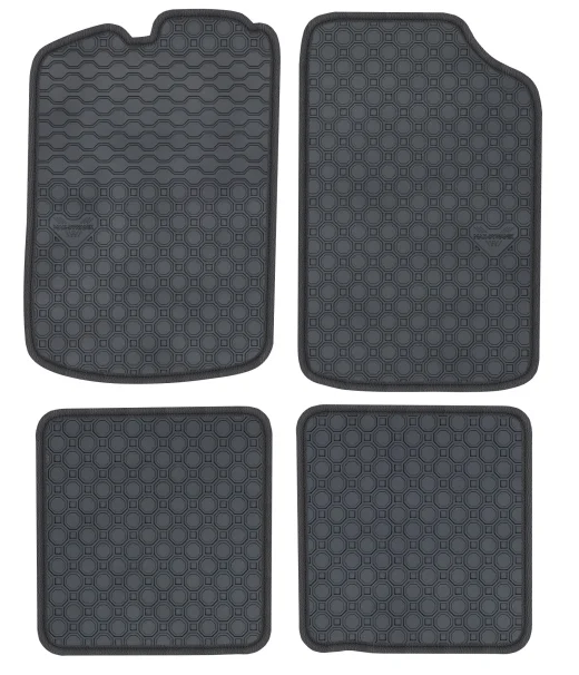 Kolor: Czarny Kolor obszycia: Ekoskóra: czarna + nić czarna Rodzaj obszycia: Nubuk czarny Surowiec: Guma naturalna Dywaniki: Dopasowane pod model Przeznaczenie: Dywaniki podłogowe