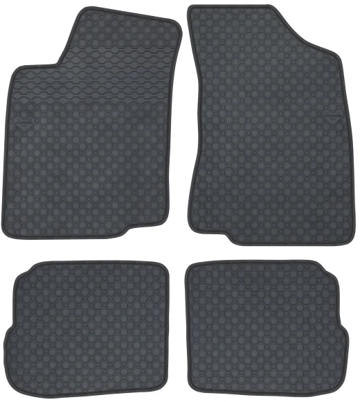 Kolor: Czarny Kolor obszycia: Ekoskóra: czarna + nić czarna Rodzaj obszycia: Nubuk czarny Surowiec: Guma naturalna Dywaniki: Dopasowane pod model Przeznaczenie: Dywaniki podłogowe