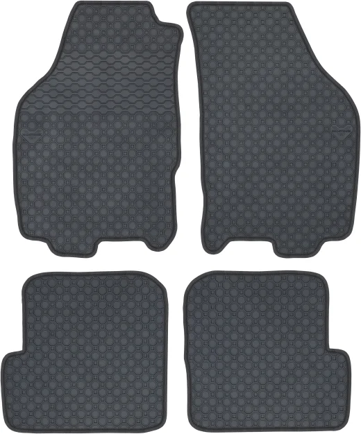 Kolor: Czarny Kolor obszycia: Ekoskóra: czarna + nić czarna Rodzaj obszycia: Nubuk czarny Surowiec: Guma naturalna Dywaniki: Dopasowane pod model Przeznaczenie: Dywaniki podłogowe